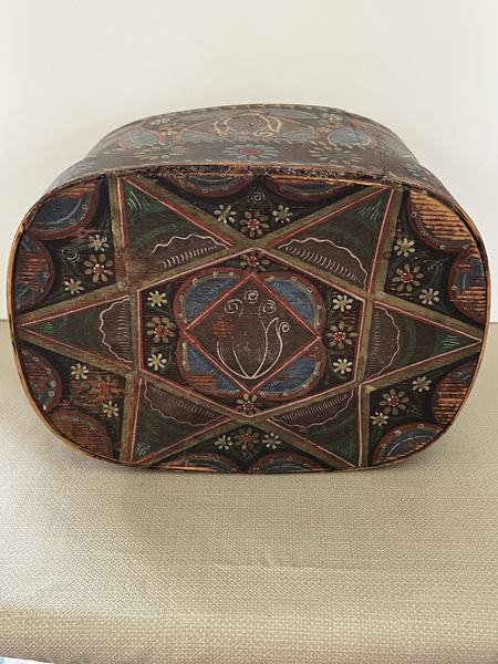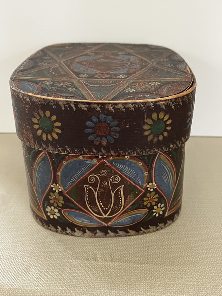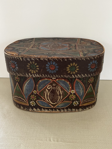 Here is a German or Pennsylvania- German lidded bentwood oval box. It is extensively decorated with flowers, blue leaves and accents on a brown ground. There is a tulip design on the top and all four sides. The top has a six-point star with flowers scattered about. 7" wide x 4" tall. A very nice box!
