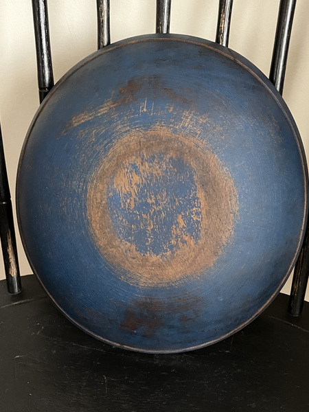 19th c. blue bowl with original old paint. There is a 1 1/4" rim and a raised foot. There is a darker area on the inside bowl which appears to be an old oil stain. 11" x 10 1/2" x 2 1/2" high, out of round.