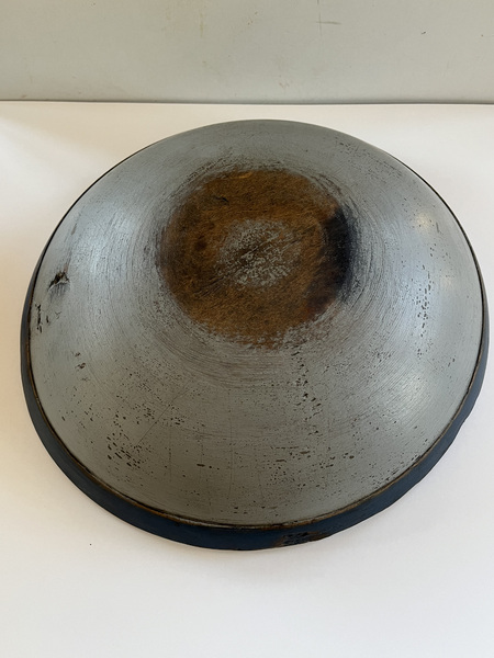 19th c. Grey painted bowl with blue rim. The paint is early and original. It shows typical wear from age and use. 12 1/4" x 11 3/4" x 3 3/4" high. A very nice bowl!
