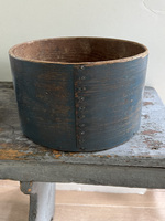 Here is a striking blue painted lidded bucket in early blue paint. It has wooden staves and metal bands. The paint has wear from use and age. There is one finger on the lid. 8" wide on the bottom, 7 1/2" wide on top, 7 3/4" tall.