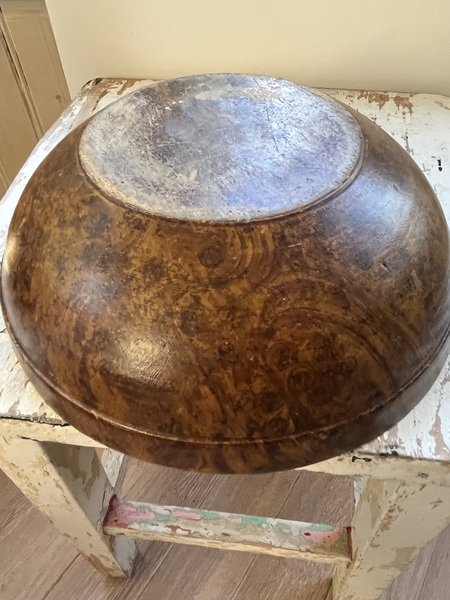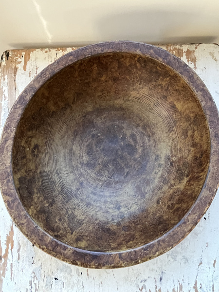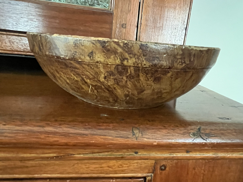 19th c. Small grain painted bowl, made to look like burl. 8 3/4” x 8 1/2” x 3” out of round. The turnings on the interior are very prominent. Excellent condition!