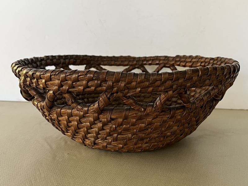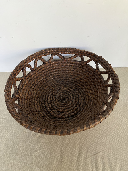 19th c. open-work rye straw basket. 10 1/4" x 3 1/2" tall. A light layer of varnish may have been applied, but it isn't real shiny. Excellent condition!
