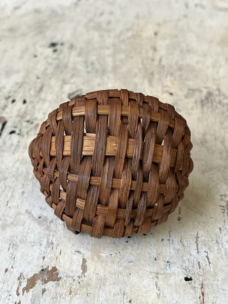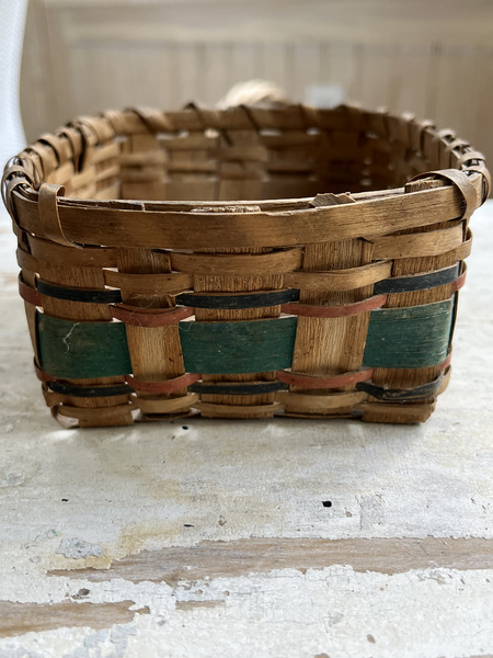 Here is a nice small splint basket on a raised base. There is a double-wrapped rim. The condition is excellent. No breaks! 7 1/4" x 6 3/4" x 4 1/2".