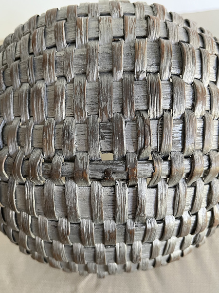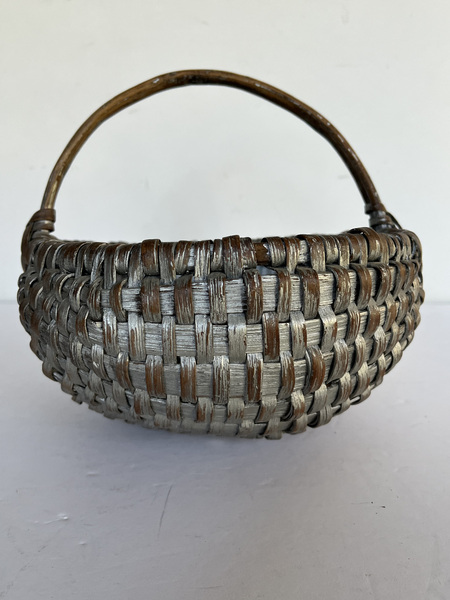 Here is an unusual small basket with early silver paint. It has God's eye ends and a wrapped rim and handle. 7" wide x 4" tall, including the handle. The basket is very firm in construction and is in excellent condition except for one 1/4" broken splint, as seen on the third photo. I enlarged the photo to show the break.