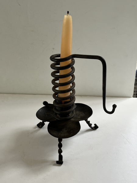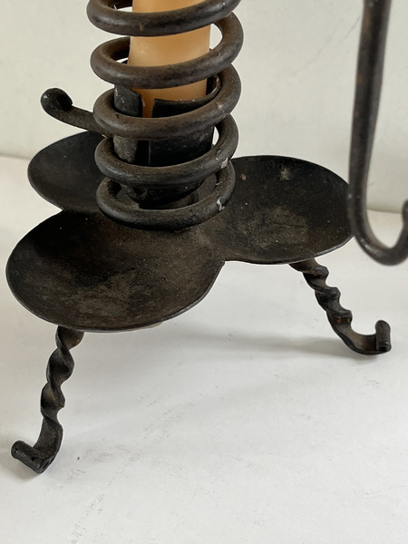 Here is a wonderful, late 19th c. spiral, iron candleholder on a tripod clover base. It has unusual twisted legs. The candle holder is adjustable with a side lever. 6 1/2" tall. Excellent condition!