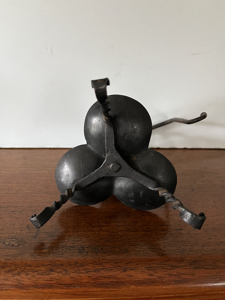 Here is a blacksmith made iron trivet with 4 heart shaped designs on top. The 3 padded feet also are heart shaped. There is typical wear and a little rust that shows it's age. The top measures 9 3/4" diameter and 4" high. A nice addition to your hearts collection!!