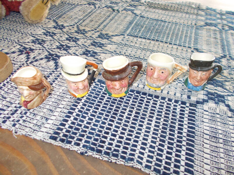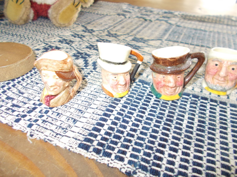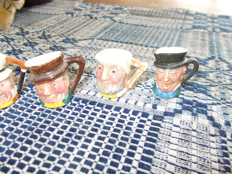 Offering five little toby jugs all marked on the bottom HAND PAINTED LANCASTER ENGLAND. 1-1/4" tall. Great Christmas gift.