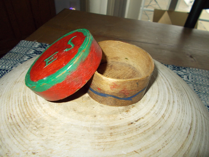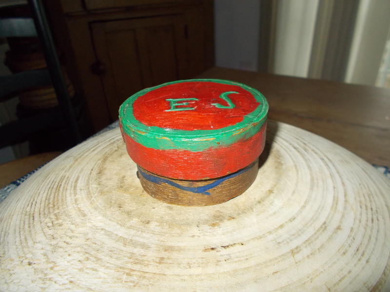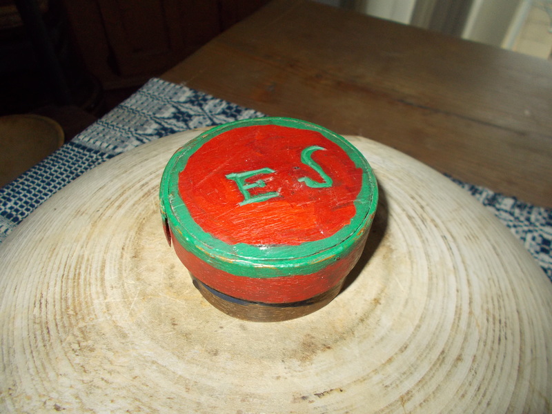 Offering a little pantry or pill box with paint decoration and etched initials E B. Measures 3" diameter x 2" tall.