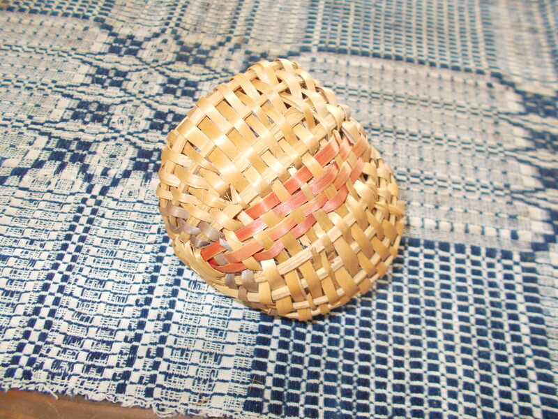 Offering a mini basket, nicely woven of spling with red and green weavers on the bottom. It measures 3" diameter x 2-1/2" to top of carved handle. Basket is darker than photo 2 and 3.
