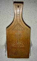 A very nice carved wooden decorative Peel, probably from the mid-1950s and most likely meant to hand on the wall. There is a beveled edge, meaning you could pick up a loaf of bread, etc., out of an oven and the piece does feel like it has been used, but I am not sure about age. It measures about 12 ¼” x 4 ¾” and has nice color and feel. The carvings appear to be hand-done and there is a hole at the top of the handle for hanging. Fine to very fine condition: there is an age/shrinkage line down the center, but the integrity of the piece is not threatened. Not edge splits, etc. A nice decoration for a country kitchen.