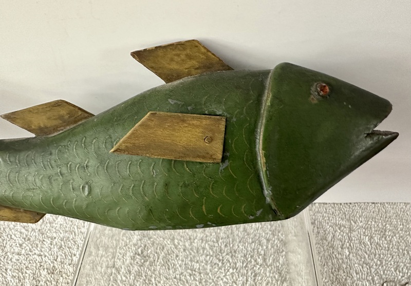 13” Carved Wooden Green Painted Fish This carved wooden green painted FISH has wonderful detail and an overall presence. No evidence that it ever was a fishing lure or decoy (no weights, no rig-lines, etc.), but it does have attached fins and gills and 2 glass eyes. Graceful form, it measures about 13” from mouth to tail and sitting on the table (flat bottom so it sits evenly) it is 5” to the top of the tail. The fins are metal and the body up to the tail is carved from one piece of wood. The tail is 2-piece construction. Something different to add to your decoy collection!