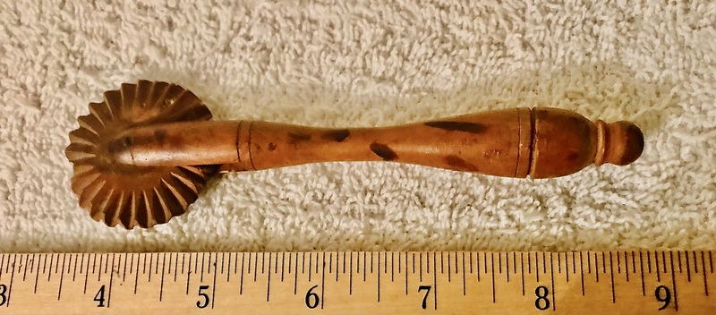An early (mid-late 19th century) wooden pie crimper with turned handle and nicely carved wheel. Overall length is 5 ¼” and the wheel is 1 ½” in diameter. Wheel turns freely and the whole piece has a nice patina with great color. A few small (tiny) edge chips in the wheel but nothing that prevents you from using it if so desired.