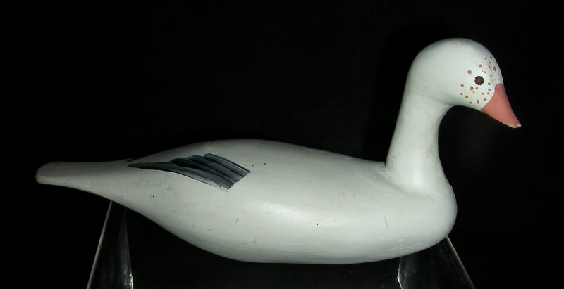 A nicely carved and painted miniature Snow Goose, signed “S. Pierce HDG MD” (Frederick Steiner Pierce, Havre de Grace, Maryland). Steiner pierce is the brother of the more famous Maryland carver Jim Pierce. This bird dates c. 1990 (Steiner Pierce did not start carving until he was in his 70s). The bird is about 6” from breast to tail and about 3 ¼” high. The head is nicely turned to the right, and Pierce signed it in pencil (lightly) on the bottom. Excellent original condition: no splits, cracks, etc. and the paint is untouched. You don’t find many snow goose decoys.
