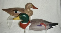 A pair (male/female) of half-sized Mallard Decoys, signed on the bottom “S Pierce, HDG, MD” (Steiner Pierce, Havre de Grace, Maryland). (Frederick) Steiner Pierce is the brother of the more famous Maryland carver Jim Pierce and his birds very much resemble those carved by his brother. Each bird is 10 ¼” from bill to tail and about 4 ¼” to the top of the head. Both retain their original, detailed paint, including painted eyes. Both are in very fine, original condition with no chips, cracks, splits, paint loss, etc. Steiner Pierce began carving when he was in his 70s and I would date these decoys c. 1990.