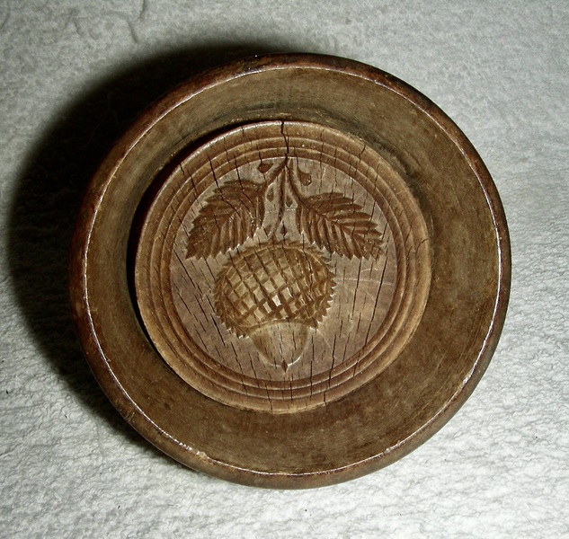 A carved maple Helmet Butter Mold w/ Carved Acorn & Leaf Decoration. The helmet is 3 5/8” in diameter and 2 ¼” deep. The plunger about 5” to the top of the knob. Very fine condition with crisp carving. 2 minor shallow age splits on the top of the helmet and one the top edge of the mold, along with some very shallow age lines on the face of the plunger.