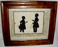 A cut silhouette of 2 children (identified as Miss Isabella Hawkins and Alfred Borradaile Hawkins of Leamington (UK) and dated 1837. The silhouette includes the notation (both front and back) that it was made by Edouart, the famous itinerant silhouette artist of the period. A Google search of the children resulted in a hit on Alfred, indicating that he was the author of a short pamphlet on taxation written in 1875. In this silhouette, Isabella is holding some flowers and carrying a small pail or basket in her right hand; Alfred is holding a whip and seems to be talking (taxation??) with his sister. The silhouettes are mounted on paper with an elaborate foliage border and there is a hand-written document on the back titled “WOMAN” and dated July, 186?. This silhouette is framed in a very nice figural maple frame; sight size is 10 ¾” x 9 7/8” and overall frame size is 14 ¾” x 12 ½”. Condition is very good: no rips, tears, etc and only some very slight staining (just to the left of Isabella and above and to the left of Alfred’s head and to the right of his shoulder). Not examined out of the frame.