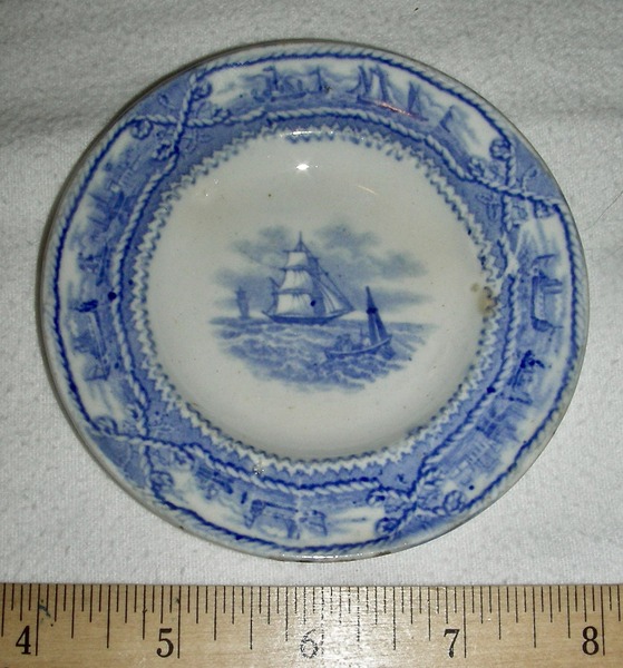 A 4” BLUE transfer American Historical Staffordshire Cup Plate in the “American Marine” pattern by Francis Morley, c. 1850. This BLUE transfer is an unlisted form of an American Marine Cup Plate, which David Arman, in his book “Anglo-American Ceramic Cup Plates – Part I” lists ONLY in brown transfer! The scene on this cup plate shows a large sailing ship with a smaller ship in the foreground. The full border includes 4 cartouches of various sailing vessels. From an important California Cup Plate collection, the plate is in excellent condition with no flaws, nice color and a shiny glaze.