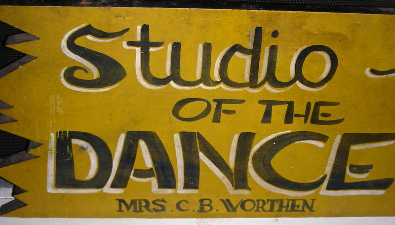A mid-20th Century Sign "Studio of the Dance, Mrs. C. B. Worthen" in original surface. Saw-tooth ends with mustard yellow background and black and white shadow letters. 20" x 9 ½" x ¾" thick. Single board. Very fine condition with no splits, cracks or significant losses. Some very minor edge bumping (top-left being the most noticeable) and a little rubbing on the left side of the sign on the letter "D" of Dance. Nice, mellow patina. Will fit in one of the new "Large Flat-Rate Priority Mail" boxes.