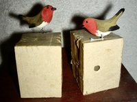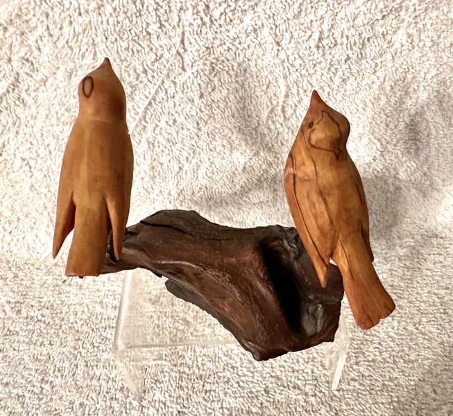 2 similarly carved wooden song birds mounted on a wood base. The carving is signed (illegible to me!) and dated 1981. The birds are not painted; one has its mouth open in song, the other does not. One bird (with the open mouth) is about 2 ¾” from beak to tail; the other, at 3”, is slightly longer. Both are about 1 ¾” high and are attached to the wooden base with metal leg/feet. Overall dimensions of the piece: 4 1/2" x 1 3/4" x 3 3/4" high. The wings are carved and the eyes painted on. The piece is signed on the base and dated 1981. Unfortunately, I cannot make out the signature. Excellent condition with no cracks, breaks, etc.; the bird with the closed-mouth has a tiny chip in its tail.