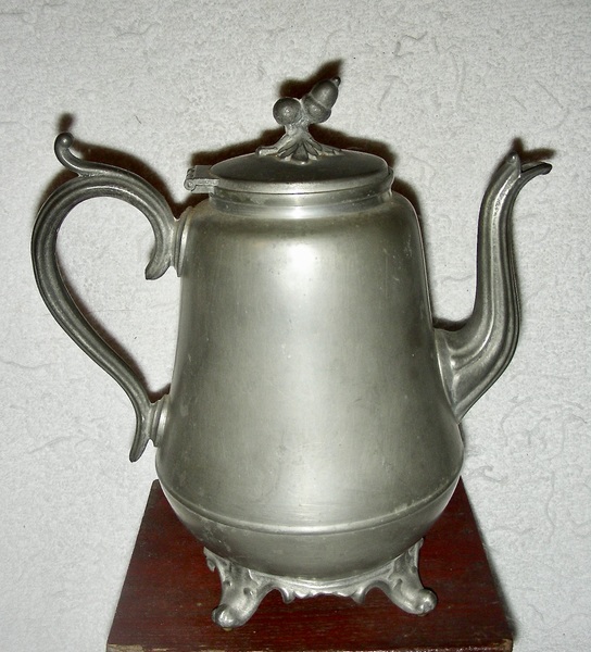 An American Pewter Teapot, marked Danforth & Boardman (TD & SB – Thomas Danforth & Sherman Boardman of Hartford, CT). Dating to c. 1840, the teapot has 4 legs (as part of a base), an acorn and oak leaf finial on the lit, scrolled handle and molded goose-neck spout. The teapot is 9 1/2” to the top of the finial and 8 ½” from handle to spout. It retains the dull, natural finish and is in very fine condition with no splits, holes or breaks and only 1 minor dent on one side. There is a nice, impressed mark ((TD & SB in a rectangle) with some number (9 4 7). Looks great on the shelf!