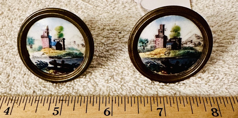 A pair of early 19th century (c. 1800 or a bit earlier) Battersea Enamel Mirror Supports (or posts), used to provide support for mirrors hung on the wall. Both show a similar (as similar as 2 hand-painted scenes can be) view of 2 large buildings in the countryside. The enamels are framed in a brass? (not magnetic) round frame and retain their original “screw into the wall” posts. Each framed image is 1 5/8” in diameter and the posts are 2 1/8” long. Very fine condition with no breaks or cracks and the posts are securely soldered to the round frames.