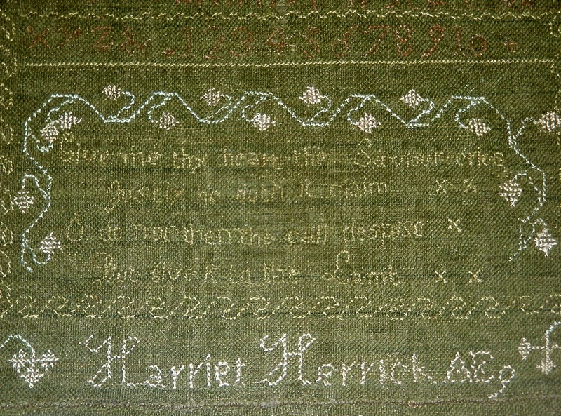 Harriot Herrick stitched her sampler on green linen when she was 9 years old. This “Linsey-Woolsey” (so-called because of the green linen used) includes 3 alphabets, the numbers 1-10, Harriot’s name and age, a most elaborate border and a religious verse: “Give me thy hear the Saviour cries, Justly he doth it claim. O do not then the call despise, but give it to the Lamb.” (This verse comes from “The Gospel Treasury,” a compilation of works by William Collier, Pastor of the Baptist Church in Charlestown, MA, 1811.). Harriot’s sampler is stitched (very neatly and very finely) in white and pink silk thread. It measures 9 ½” x 13 ½” (sight) and is framed in an old (and refinished) but probably not original empire frame (frame size is 12 ¼” x 16 ¼”). Harriet most likely lived in Northeastern Massachusetts or Southern New Hampshire, and made the sampler c. 1820. The sampler is in excellent original condition! Clean and very tidy, there are no stains, tears, holes, etc. The stitchwork is complete and precise. Not examined out of the frame.