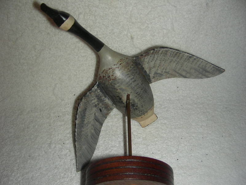 A miniature carved Flying Canada Goose on a stand. Wonderful original paint and great form. The bird is about 7 ½” from beak to tail and the wing span is also 7 ½”; on the stand, it sits about 6” high. The paint is not blemished, but the left wing has been re-glued. The rest of the goose’s body is all one piece of wood. The carving was probably done in the 1960s or 1970s, but there is no signature or identifying mark.