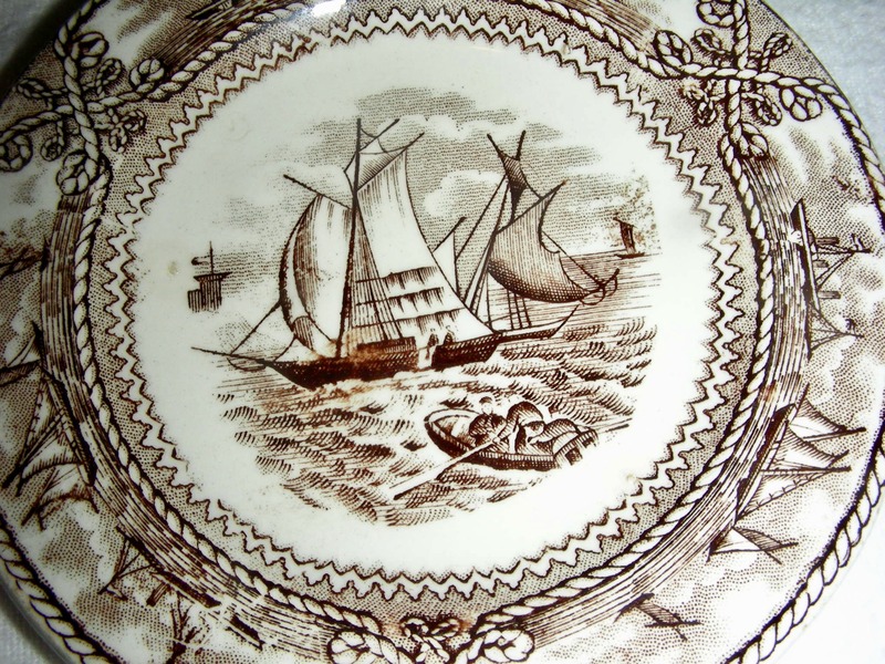 A 4” brown transfer American Historical Staffordshire Cup Plate in the “American Marine” pattern by Francis Morley, c. 1850. The main transfer shows several relatively small sailing ships and a rowboat in the foreground. The full border includes 3 cartouches with a variety of ships surrounded by a “rope” border. This plate is carries and impressed mark. From an important California Cup Plate collection, the plate is in excellent condition with no flaws, a crisp transfer and a shiny glaze.