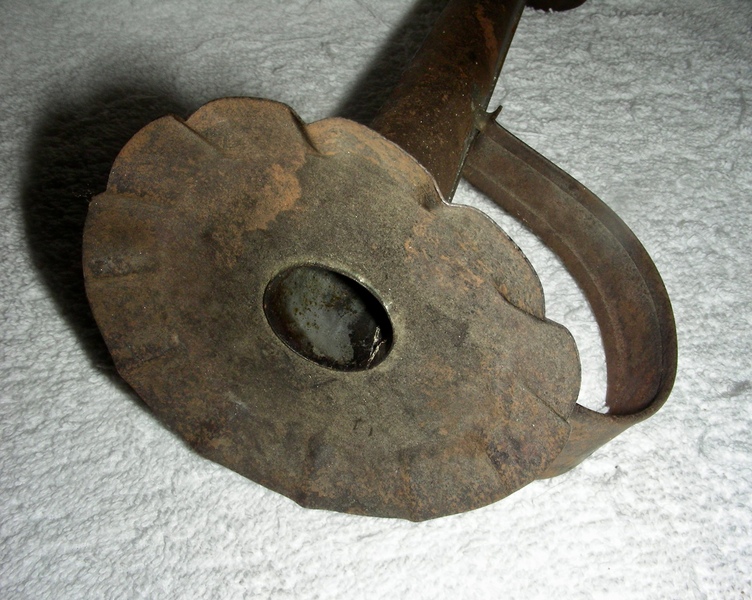 A single pan iron betty lamp dating from the early 19th century or perhaps a bit earlier. The pan is a bit deeper than most that I have seen and measures 2 ¼” in diameter x 3 ¾” from spout to handle; the handle is 4 ½” high and made with 2 pieces of iron, held together with rivets. No cracks or breaks and minor surface oxidation which is highlighted by the digital photographs. One of the earlier examples of a betty lamp that I have seen.