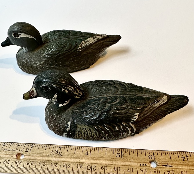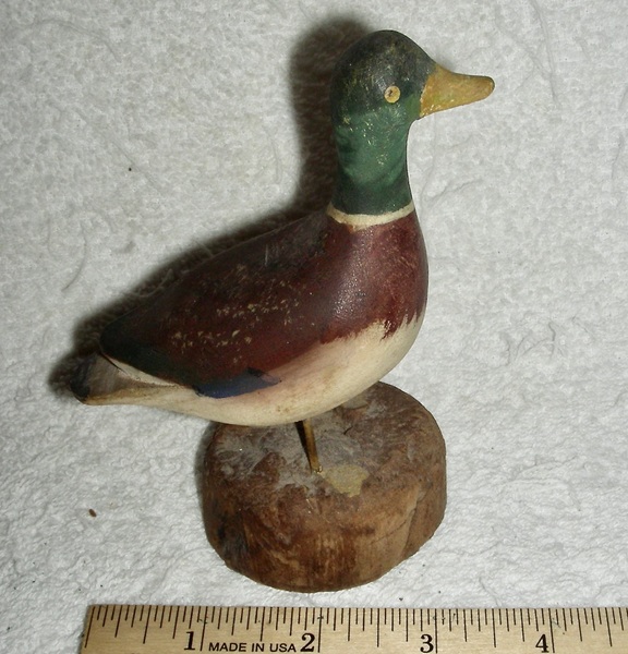 These 2 miniature ducks are carved from chunks of a very light and porous wood, most likely Balsa. No denying that they show extensive wear but enough of the original paint remains to allow me to call them Mallards. The male, with his head slightly turned, measures 4” from beak to tail and is 2” high at the head; the female is 4 ¼” from beak to tail and also 2” high at the head. There are faint impressed marks on the underside of the female and some writing on the bottom of the male: both are illegible (to me, at least). In addition to their extensive paint wear, the tip of the male’s beak has been broken off (and worn smooth) and it appears that the head of the female has been reattached (I know: “Other than that, Mrs. Lincoln, how was the show?”) Some things are just fun!