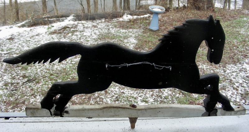 One of the most graceful wood carvings of a running horse I have ever encountered: a mid-20th century Running Horse Weathervane fragment, painted black and exhibiting incredible form. The fragment is 22 ½” x 9”x ¾”. There are minor imperfections: 2 small chips on the ears, and some repairs to where the hooves, but nothing detracts from the incredible form. The painted surface is probably mid-20th century also. This one is special!