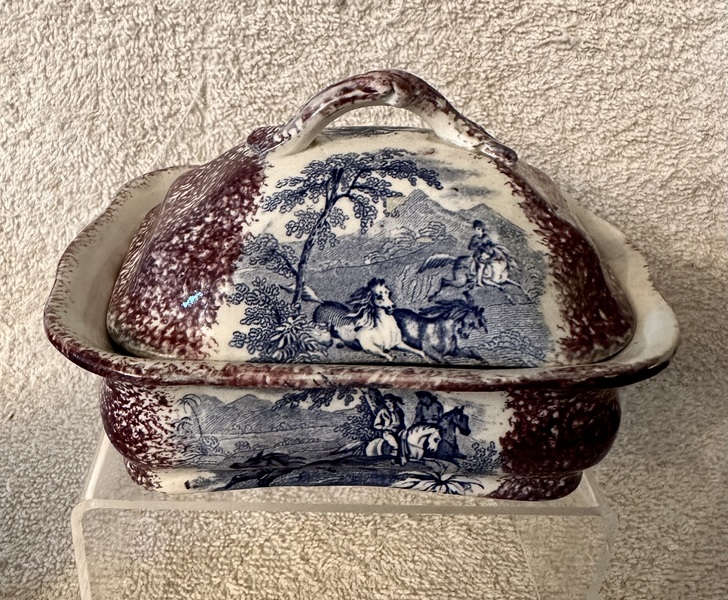 This 2 color (purple & blue) Staffordshire covered box includes 4 separate scenes from the Peruvian (Horse) Hunt Pattern by Anthony Shaw, c. 1850. All the views involve chasing wild (I presume) horses in a tropical setting. The box measures 5 ½” x 4 3/8” x 4” (high with the lid on). This could be a butter tub or a soap box, although there is no little drainage insert. Excellent condition with no chips, cracks, lines, etc. The transfers are clear and the colors strong. A very unusual piece of transferware, and although the pattern is listed in several sources, the form is not. Great as a dresser box, or even to hold M & Ms!
