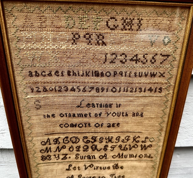 A small, probably English, cross stitch sampler with a great verse: “How blest the maid whom circling years it wove Her God the object of her warmest love Whose youthful hours successive as they glide The book, the needle and the pen divide” This verse was very popular in the early 19th century and often included in a young lady’s early attempts at needlework. Whoever did this piece (unfortunately, she did not sign it!) did a wonderful job, including the verse, 2 alphabets and the numbers 1-10. There is a versy decorative band of flowers across the middle of the piece and a flowering vine swag border. The sampler measures 12 ¼” x 12” (sight) and is framed in an early painted wooden frame that measures 13 ½” x 13”. It is in excellent condition, with no holes or stains or missing stitches.The color remains strong and there is no staining.