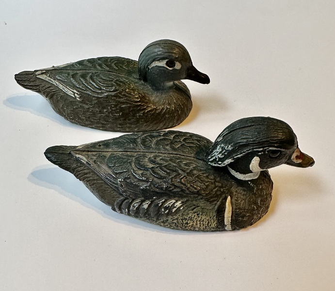 2 Salesman’s Sample Duck Decoys made by Sport Plastic, c. 1960s. These miniature ducks (Wood Duck drake and hen) were used as display pieces so salesmen would not have to carry full sized decoys around to show potential buyers. They are very light, made from thin, flexible molded plastic, and hollow. The male is 5 3/4” from beak to tail and the female slightly larger; both are about 2 ½” to the tops of their heads. Both are marked with an impressed oval brand (“Sport Plastic Made in Italy”); easier to read on the than on the female. Original paint with only minor wear. The condition ion both s very fine with no cracks or breaks, etc.
