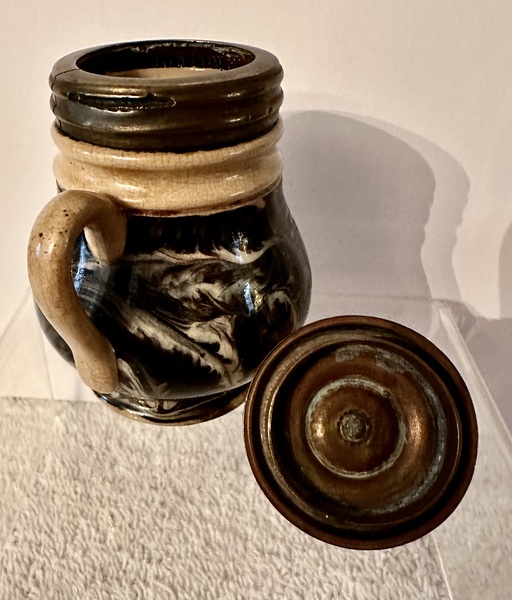 A wonderful marbleized Mocha Ware Mustard Pot with an added lid (bronze). The pot has a wonderfully colorful (black, brown, blue, gray, white) swirl of marble decoration with white rim and handle It measures 3 ¾” high (top of finial on the lid) and 1 ¾” diameter at the base. The bronze rim (and lid) was added at some point and it is securely attached. No maker’s marks (as is the case with most mocha of the period) and the piece dates c. 1820-1840. Heavy and glossy glaze, but I can find no evidence of restoration/repair (I do not have a black light). No chips, cracks, damage, etc. A nice example of an uncommon form of mochaware.