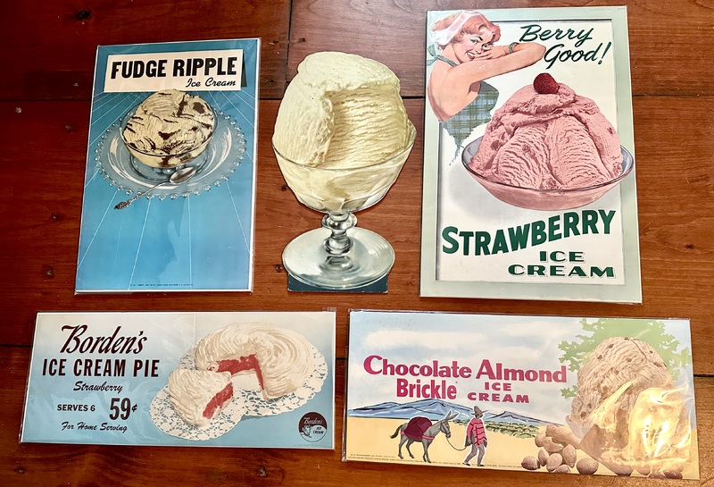 A group of 5 vintage 1950s paper ice cream signs or posters. These probably were for display in an ice cream parlor or shop and except for the one marked Borden’s, 4 are simply generic flavors. They are in excellent, near-mint condition. 4 are backed by foam core and protected in plastic; the stand-alone dish of Vanilla is not wrapped and has a small crease in the stem of the glass (see photos). No other issues or damage. The dimensions (including the backing board): Fudge Ripple: 12” x 18”; Dish of Vanilla Ice Cream: 9 ¾” x 16 ½”; Strawberry: 13 1/4” x 20”; Borden’s Ice Cream Pie, 20 1/8” x 8 3/8”; and Chocolate Almond 20” x 9”. All except the dish of vanilla have hangers attached to the back. Nice decoration for a kitchen or den – or your ice cream parlor!. Additional photos available; just ask!