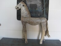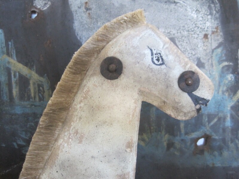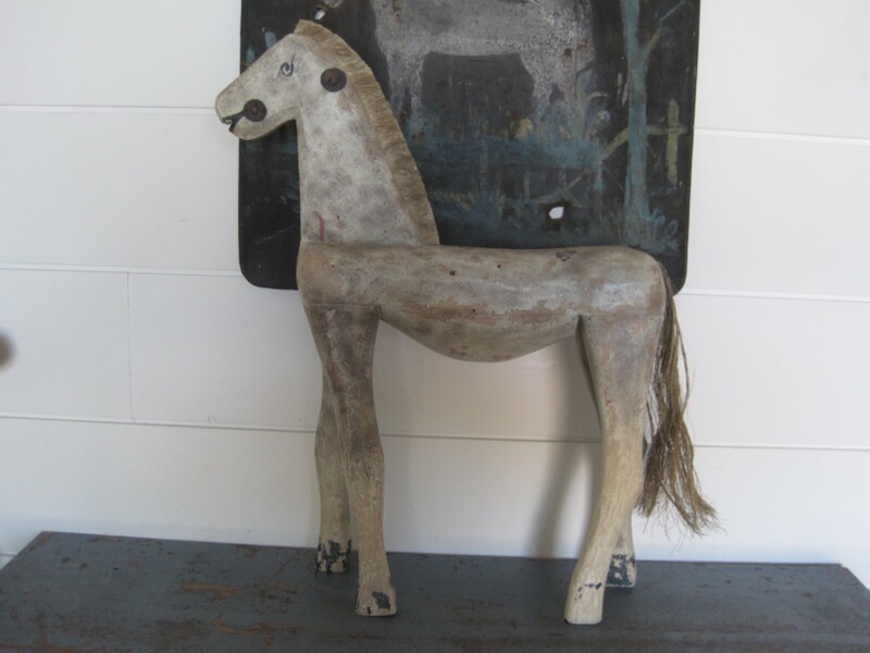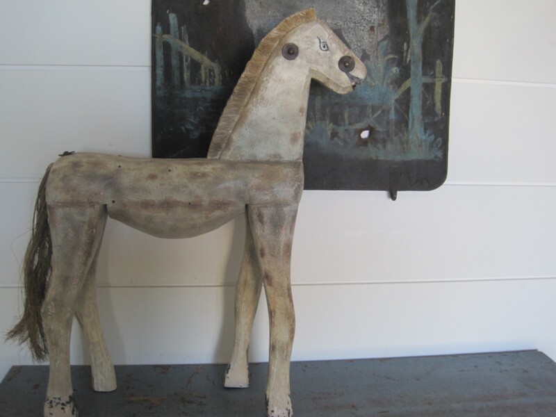 ANTIQUE, FOLK ART, WOOD, ORIGINAL PAINT, HANDMADE, FRENCH TALL HORSE, PRIMITIVE, COUNTRY FIND! This Antique Folk Art Tall Handmade French Wood Horse is Perfect for Display! APPROX: head height is 21 1/2" length is 17" and deep is 4 5/8" CONDITION: scratches, stains, dents, chips, paint loss, along with wear and use as expected by age