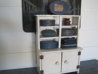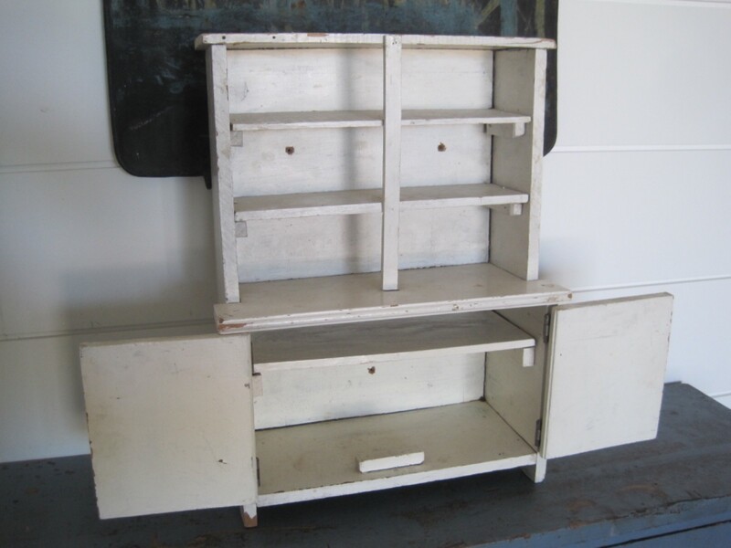 VINTAGE, HANDMADE, WOOD, ORIGINAL WHITE PAINT, CHILD'S STEPBACK CUPBOARD WITH SHELVES AND TWO DOORS, CAN BE SET OR HUNG, PRIMITIVE GREAT AMERICAN COUNTRY FIND! This Wonderful Vintage Wood Stepback Child's Cupboard is Perfect for Display! APPROX: back height is 16 3/4"; front height is 8"; width is 12 5/8" and depth is 5 3/4" CONDITION: paint loss, chips, stains, scratches, dents, along with wear and use as expected by age
