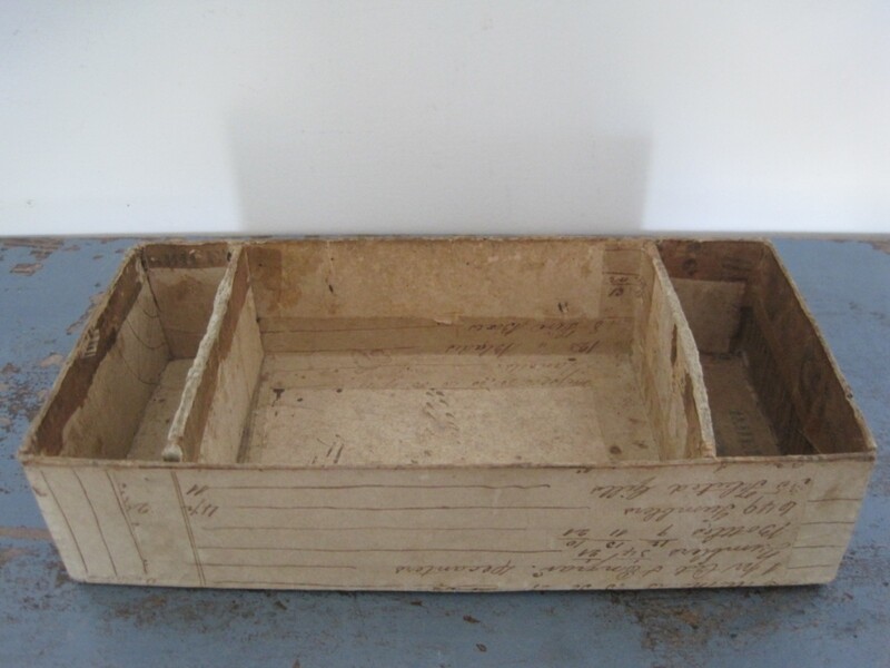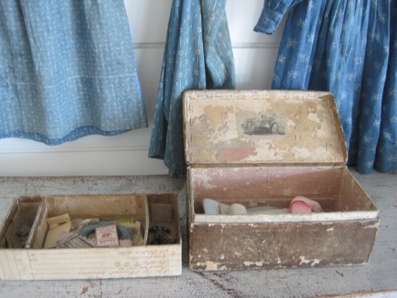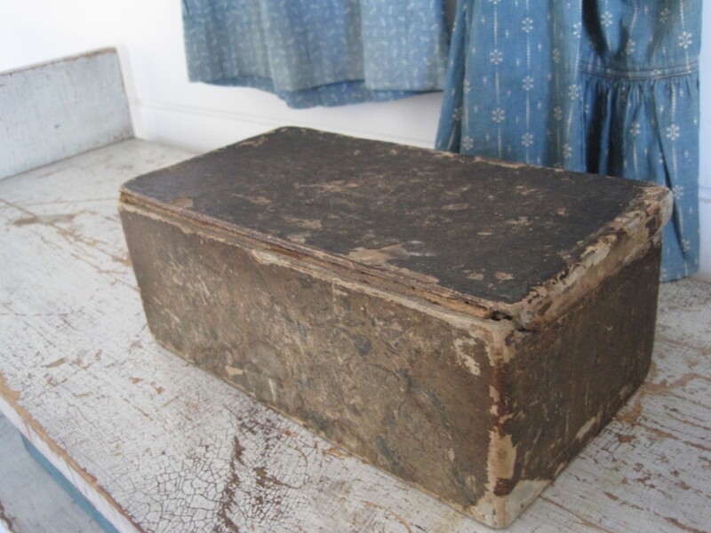 19TH CENTURY, HAND SEWN WALLPAPER COVERED SEWING AND NOTIONS BOX, PULL OUT DIVIDER COVERED WITH EARLY LEDGER PAGES, THE CONTENTS INCLUDED. Beads, Buttons, Needles, Fabric, Old Label, etc. GREAT AMERICAN COUNTRY FIND! This Wonderful 19th Century Wallpaper Sewing Box is Perfect for Display! APPROX: 9" by 4 1/2" with a height of 3 1/4" CONDITION: stains, paper loss, along with wear and use as expected by age