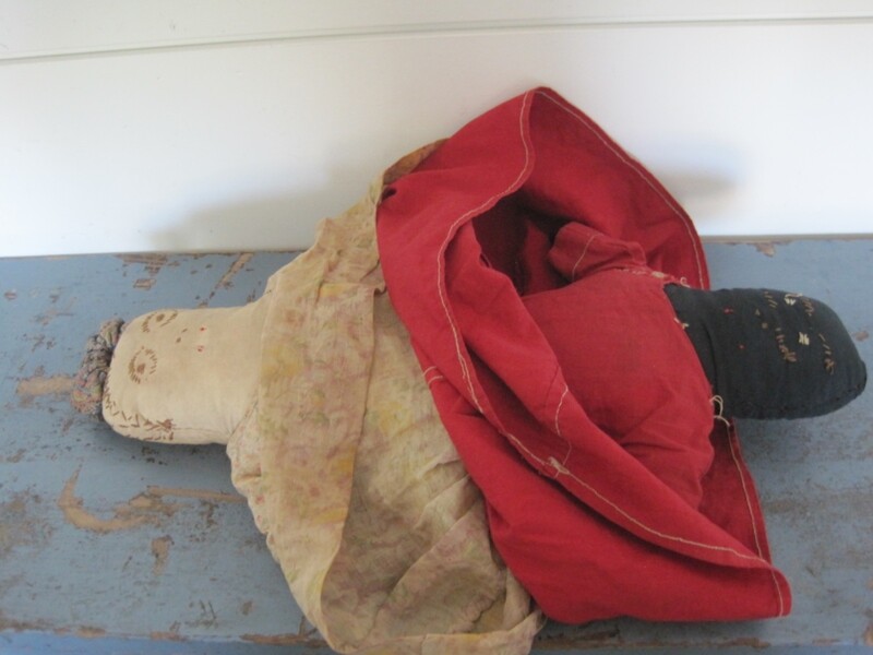ANTIQUE, FOUR HAND STITCHED FACES, BOTH ON FRONT OF BACK OF THE DOLLS, HAND MADE, CLOTH TOPSY-TURVY RAG DOLL, PRIMITIVE AMERICAN COUNTRY FIND! APPROX: height is 14 3/4" CONDITION: spots, holes, fading, along with wear and use that is expected with age
