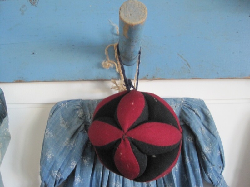 ANTIQUE, PENNSYLVANIA DUTCH AMISH, FABRIC PUZZLE BALL, FABRIC FEELS LIKE WOOL, HANDMADE, WONDERFUL, PRIMITIVE AMERICAN COUNTRY FIND! I bought a very large collection of Pennsylvania and Ohio Amish, Dolls, Stuffed Toys, Long Stockings, Mittens, Pincushions, etc. Slowly I will be listing them on Ebay when I have time. APPROX: 4 3/4" with a height of 4" CONDITION: spots, fading, pinholes, holes, along with wear and use that is expected with age