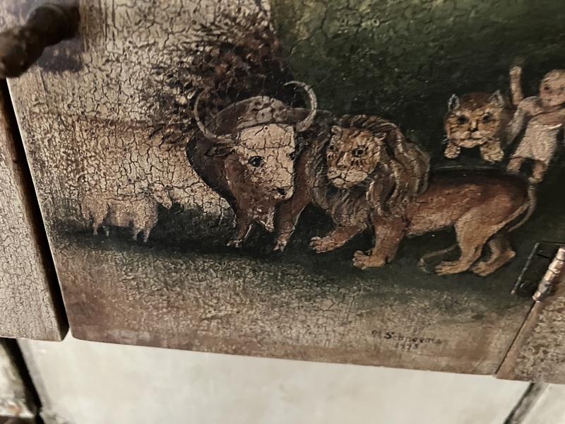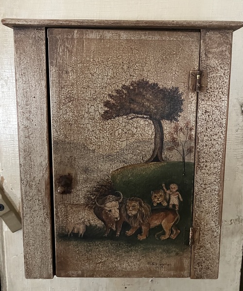 8'. x 10 1/4" x 3" deep. I purchased this many years ago from Norma, and it is a fine example of her artistry. The Peaceable Kingdom is beautifully rendered on a distressed background. Door opens to a shelf and has a working turnbuckle. (Door is slightly warped.) This is a rare opportunity to own a treasure from a renowned folk artist. 2 photos.