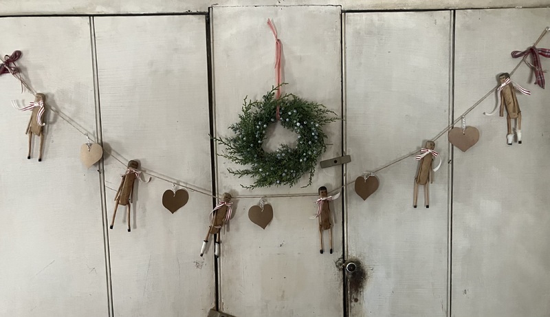 Approx. 5 feet long. Really one of a kind. Six vintage articulated elves with craft hearts on a garland . 2 photos.