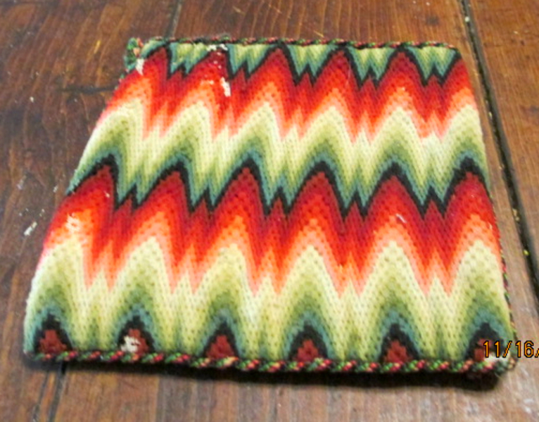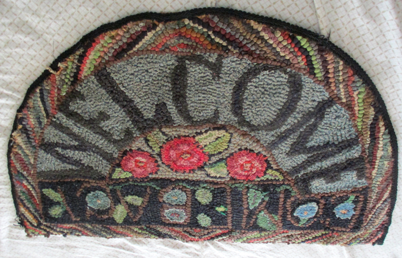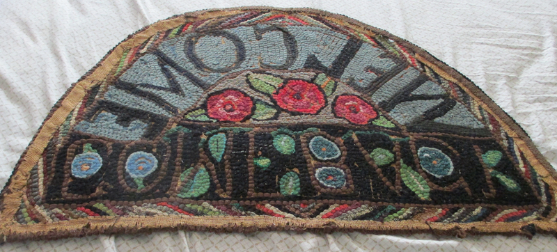 Measures 31" L by 19" high.Mid 1900's.Semi circular.,Folky. Two yarn pulls on the edge.