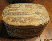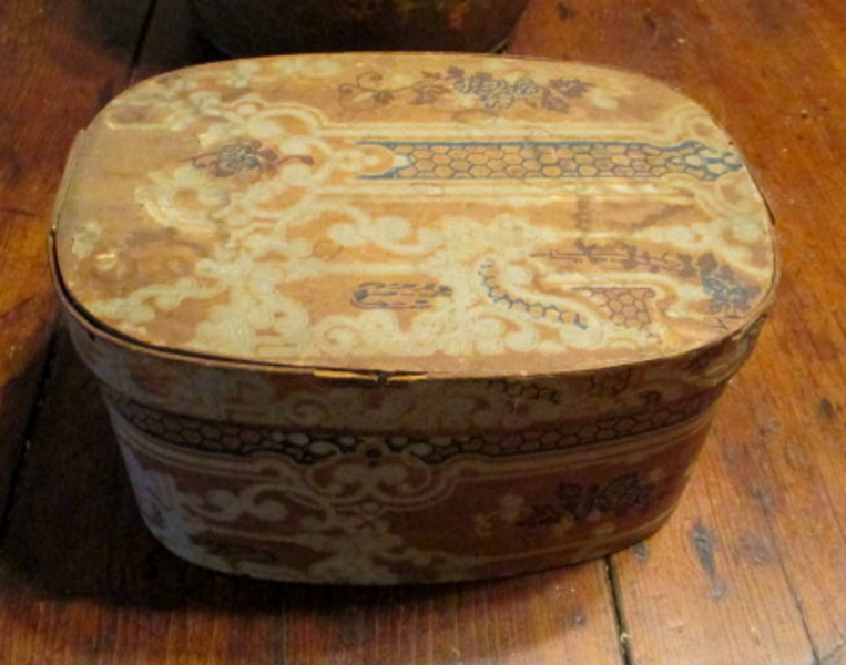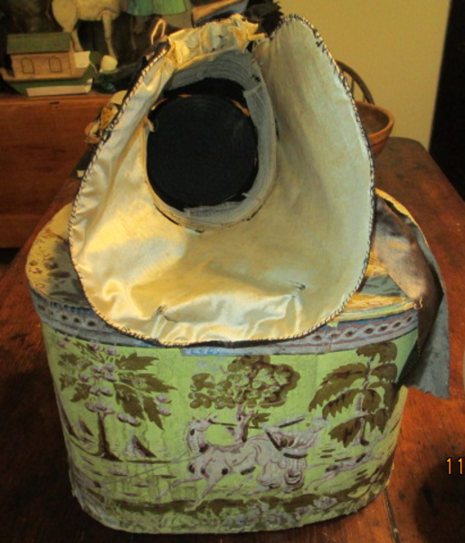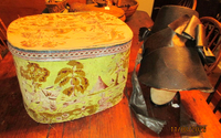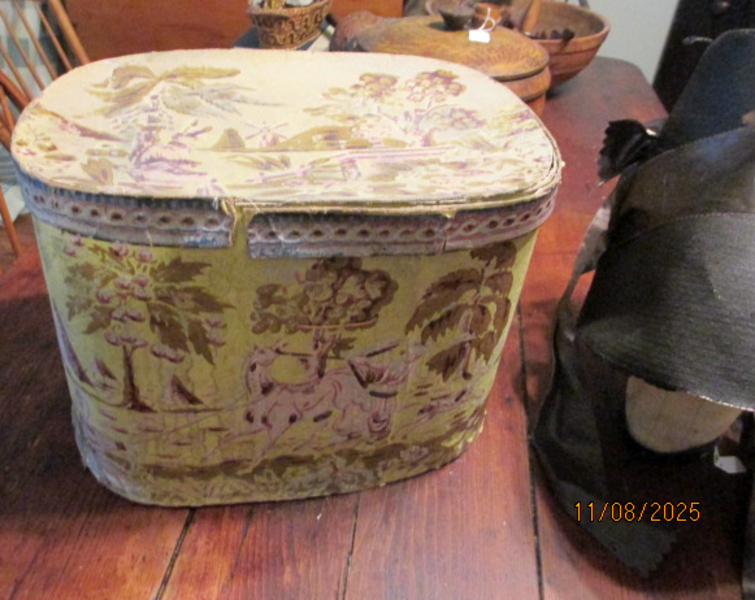New York wallpaper box covered with her bonnet made by Lavina Van Houten, later Lavina Haring. Died in 1896.Complete provenance will be included for the buyer.The wallpaper box printed on yellow paper shows a romantic view of horses and handler , within a landscape and a resting soldier.Retains the original black straw poke bonnet.The rim of the lid is partly separated and the silk lined bonnet has a split on its brim.The box measures 11 1/2" high, , 16 1/2 " high, 12 1/2" deep. All in all in good condition, with bright and unfaded paper and the bonnet is a lovely black with a cream colored perfect lining. If the buyer wishes, I can reglue the rim with archival glue.