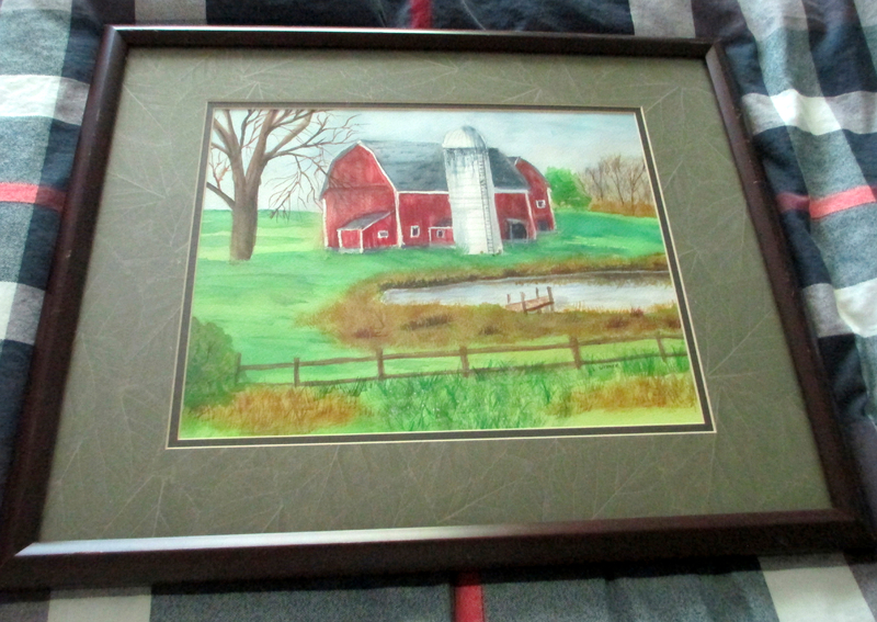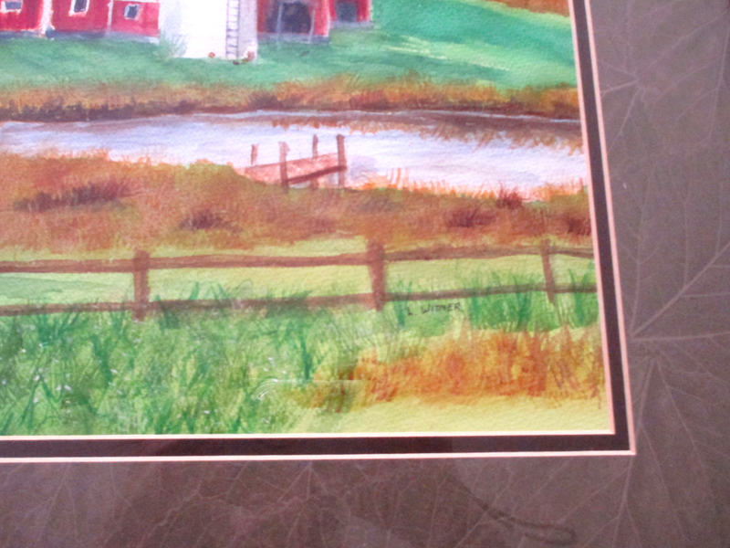 Measures 21" x 17" Watercolor on Paper , framed and matted with a leaf design and under glass.Signed by Lynn Witmer, a Birmingham Michigan artist and designer.The area was a farm in Brighton, Michigan that was cleared for a mall, etc. Her intense color and folky proportions are right from her heart.