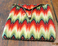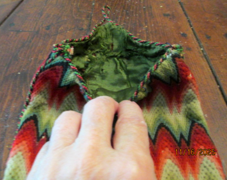 Measures 6" x 6 ".Red, green, and cream colored wool purse with a black jet button The inside dark green silk has shattered around the enclosure.The wool embroidery is in very good condition and only has a few stitches missing.A lovely Christmas gift.
