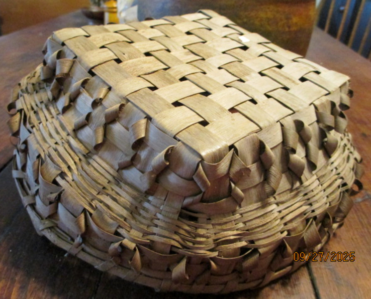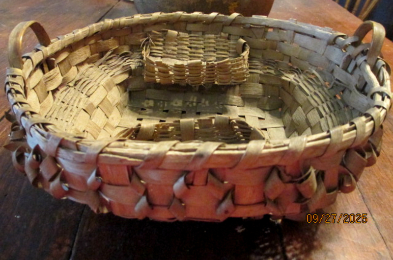 Measures 12 " wide and 4 1/2" deep. Natural unstained and unvarnished splint.Federally recognized tribe living from Maine to Nova Scotia.Made for the tourist trade.A few weavers are missing or broken.Good original condition. Compartments for sewing or work tools.