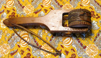 Measures under 6" long, 4 " wide, 4 1/2" high.Well patinated and decorated.1920's. Good symbols carved on the handle,which also has a thin crack.Double tacked and glued borders.Another tiny shrinkage crack on one border.Probably one of a kind.