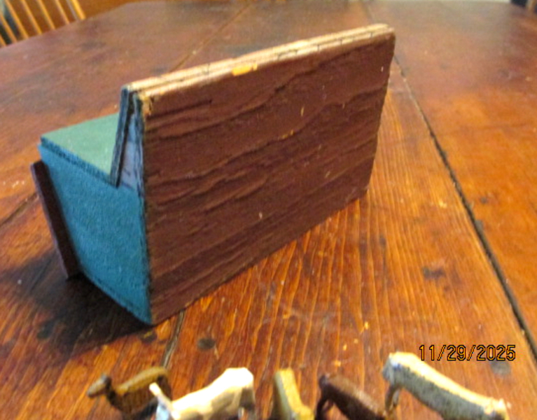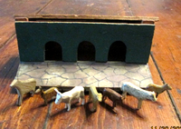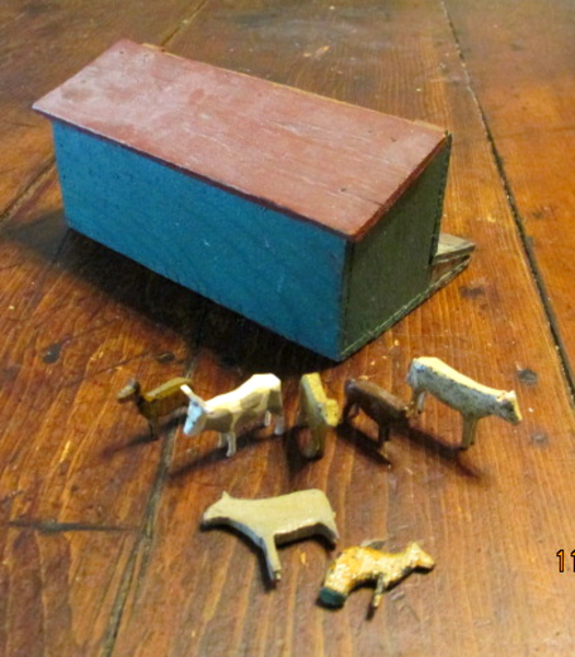 The green stable is 7 1/2" wide and 3 1/2' high.It comes with 7 wood animals : 3 cows, 1 dog, 1 fox, 1 sheep, and 1 bull. The front part of the red roof is missing and 2 animals no longer stand.There is a painted stone ramp that leads into 3 stalls.The colors are all good. Probably German and positively charming.
